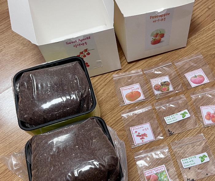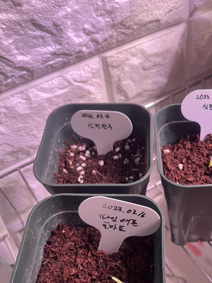 토마토 싹은 정말 금방 나와요. 코코피트에 심은지 7일만에 싹이 저렇게 난답니다. 식전반주, 파인애플, 사탕 고드름 2개를 심어줬어요. 나머지는 내년 또는 내후년을 기약해보며 천천히 심어봐야죠 🥲 공간을 너무 많이 차지해요.
