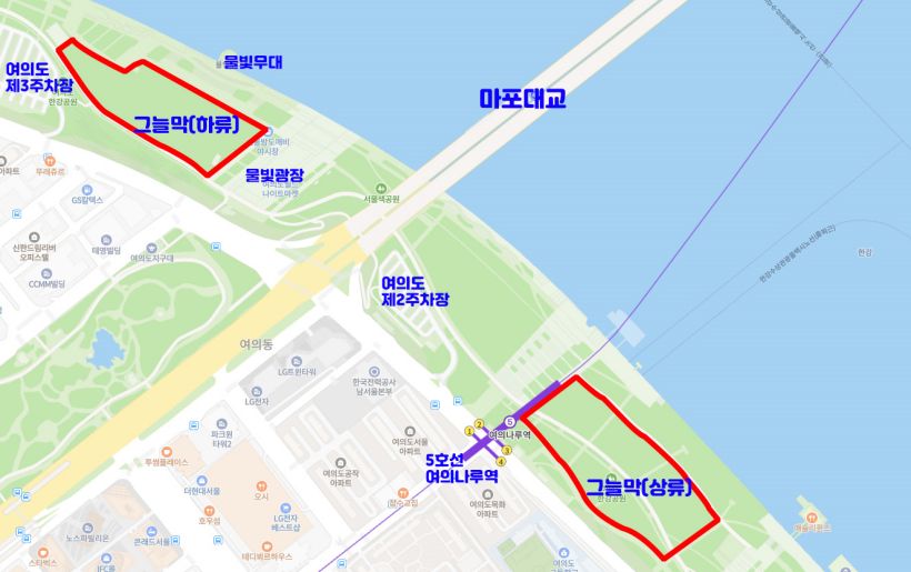여의도 한강공원의 텐트 허용 구역은 상류와 하류로 구분되는데, 제3주차장과 가까운 하류, 여의나루역과 가까운 상류가 있습니다.
