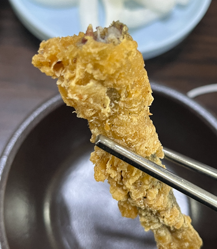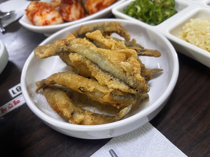 그리고 여기서만 먹을 수 있는 추어튀김이 있어요. 추가로 시킬 수도 있는데, 기본적으로 미꾸리 튀김을 밑반찬으로 줍니다. 미꾸리 튀김 이거 맛이 없을수가 없습니다. 아주 고소하고 바삭바삭합니다. 간장 찍어먹으면 딱이에요.