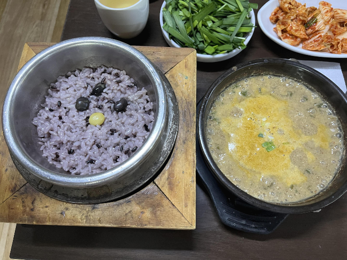 돌솥밥 ㄷㄷ... 밥 퍼내고 뜨신 물 넣고 닫은 다음, 추어탕에 정구지랑 밥 반그릇 넣어서 뚝딱입니다. 🥰 부추 넣고 후추 넣고 정신없이 퍼먹다보면 금방 배불러져요. 여기 완전 추천합니다.